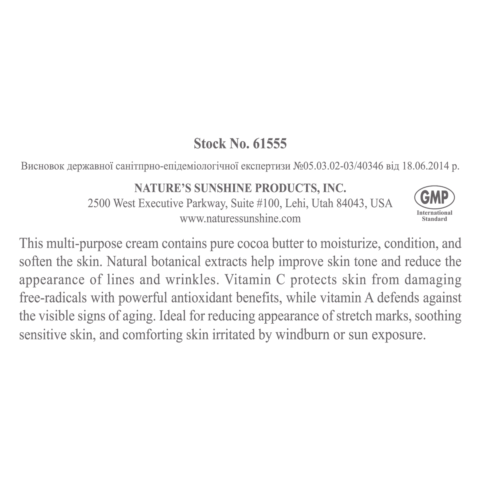 Cocoa Butter Cream содержит витамин C, который защищает кожу от неблагоприятного влияния процессов окисления свободных радикалов, оказывает антиоксидантное действие.