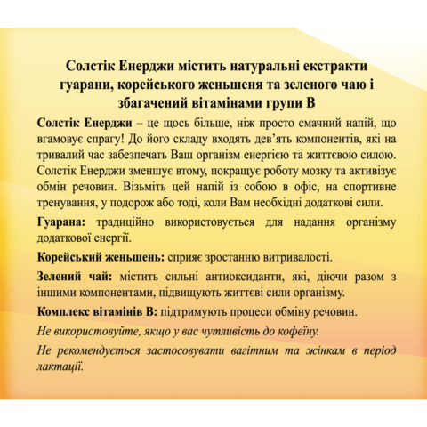 А вот эффективность Solstic Energy (Солстик Энерджи) обусловлена тем, что в основе энергетического коктейля лежат натуральные ингредиенты растительного происхождения и витамины группы В. К натуральным компонентам относятся: