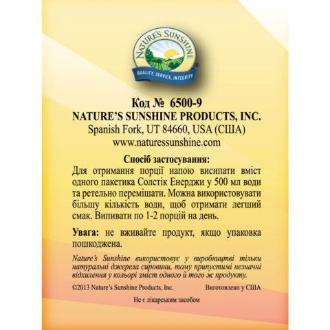 Для получения порции напитка высыпать содержимое одного пакетика Солстик Энерджи (Solstic Energy) в 500 мл воды и хорошо перемешать. Для получения более слабого вкуса можно использовать большее количество воды. Выпивать по 1-2 порции в день.