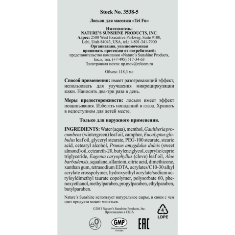 Tei-Fu Massage Lotion (Обезболивающий лосьон «Тэй-Фу» для мышц и суставов), имеющий в своем составе натуральные растительные эфирные масла, используется как инструмент для массажа с ароматерапевтическим эффектом.
